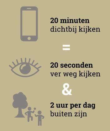 Dit kan je doen door je simpelweg aan de 20-20-2 regel te houden. Na 20 minuten nabijwerk te hebben geleverd kan je best een pauze inlassen van 20 seconden en vervolgens zover mogelijk (in de verte naar buiten) kijken. Voor kinderen is het aan te raden minstens 2 uur per dag buiten te zijn/spelen.